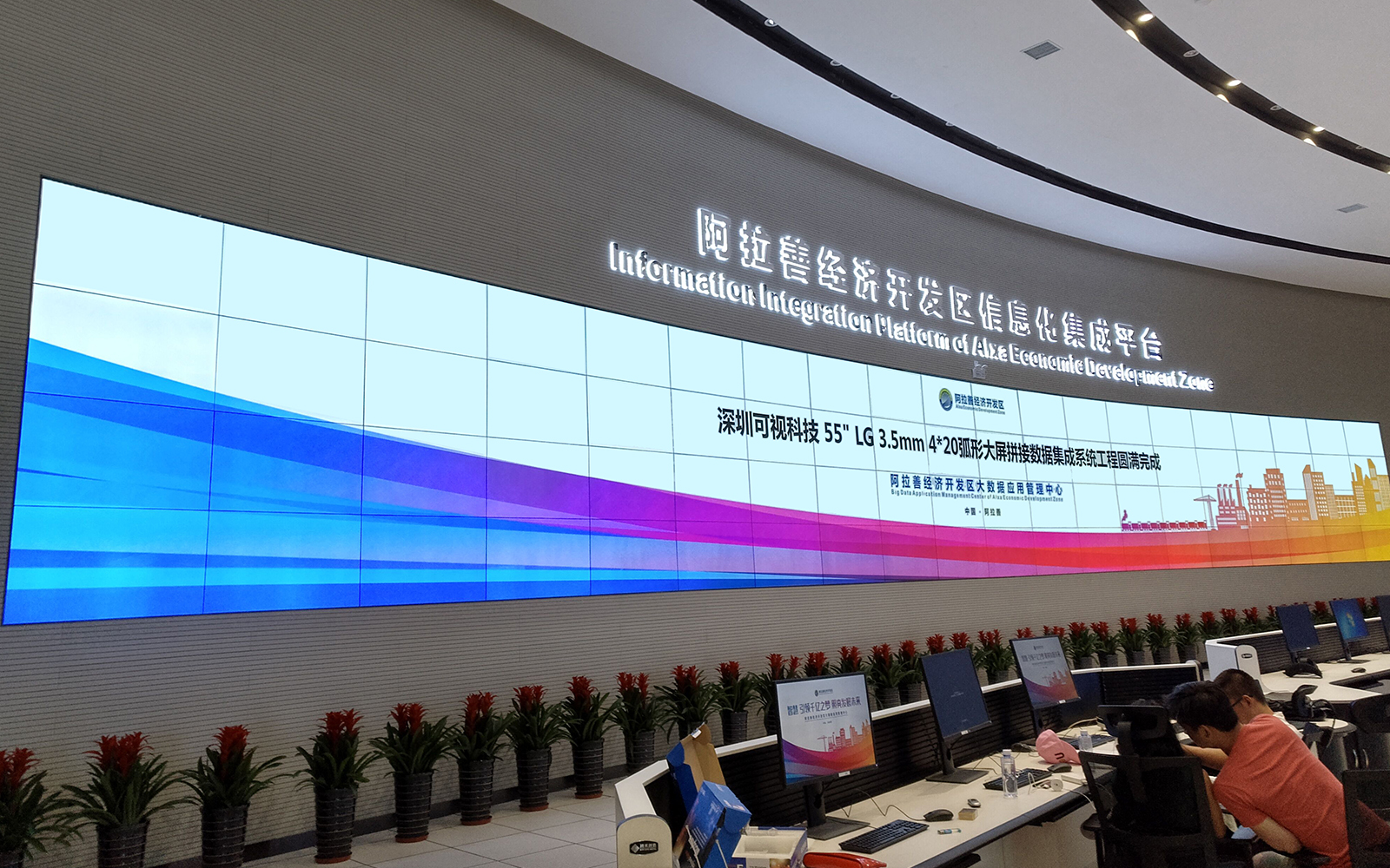 1. 數(shù)據(jù)集中顯示,合計(jì)80臺(tái)55LG原裝拼接屏弧形顯示系統(tǒng),凈高約2.5m,長(zhǎng)約24米,足夠大的屏幕可以將各種數(shù)據(jù)集中顯示到屏幕上進(jìn)行分析,從而更好的分析數(shù)據(jù)。